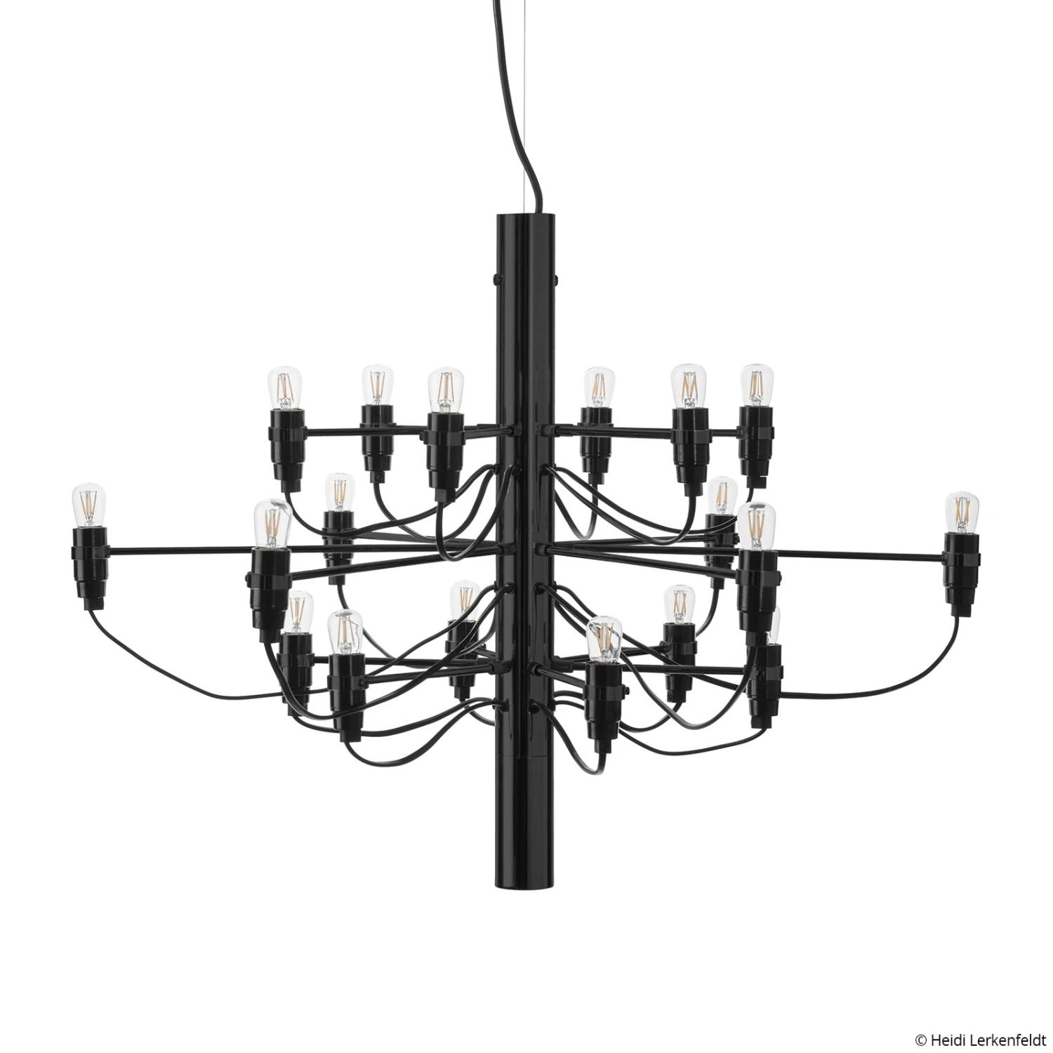 Minimalist LED chandelier in modern aesthetics – FLOS 2097/18The 18-flame lamp 2097/18 from the house of FLOS is a modern design entity, which brings together modernity and classicism in the form of this unusual chandelier. On the steel column located in the center sit different long arms, each of which carries the LED bulb placed at the end in frosted optics. This is, like the black supply cable, deliberately shown open and gives the chandelier 2097/18 its very special and individual charm. Whether placed above dining tables or in the living room, the modern LED chandelier 2097/18 adds a special touch to any room and is an exciting eye-catcher and reliable light source at the same time. Responsible for this unusual design in its original form is the Italian industrial designer Gino Sarfetti (1912-1985), who is considered one of the most important designers of lights and lamps in the 20th century. The design of the lamp 2097 was created in 1958 and has lost nothing of its stylish elegance to this day.