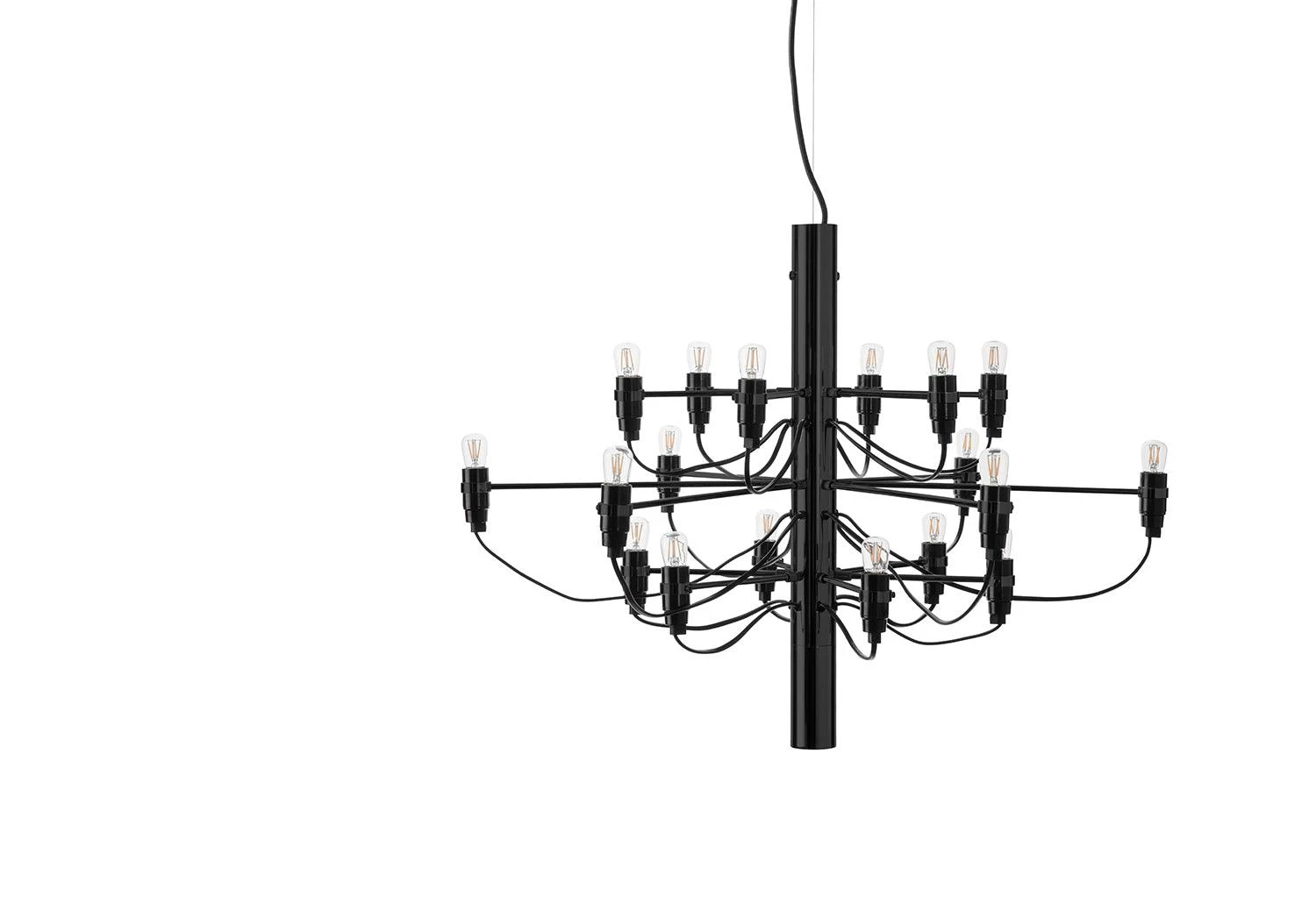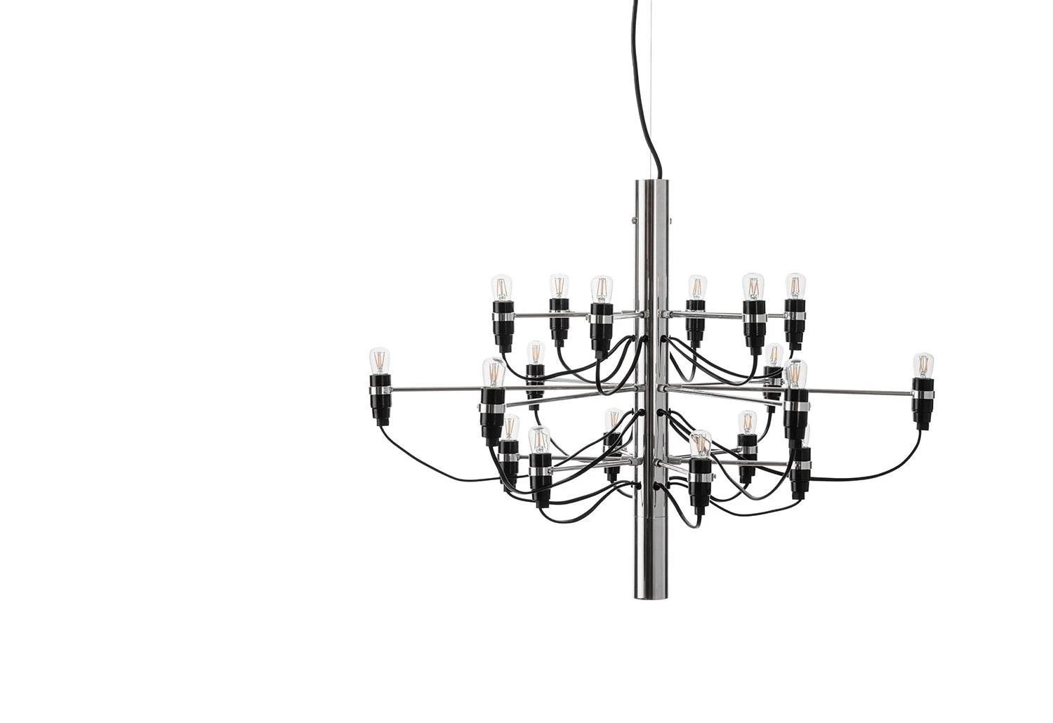 Suspension light consisting of a chandelier-like steel structure with 18 bulbs. Reinventing the classical chandelier for the modern age, Gino Sarfatti’s timeless design offers a striking centrepiece to any room.