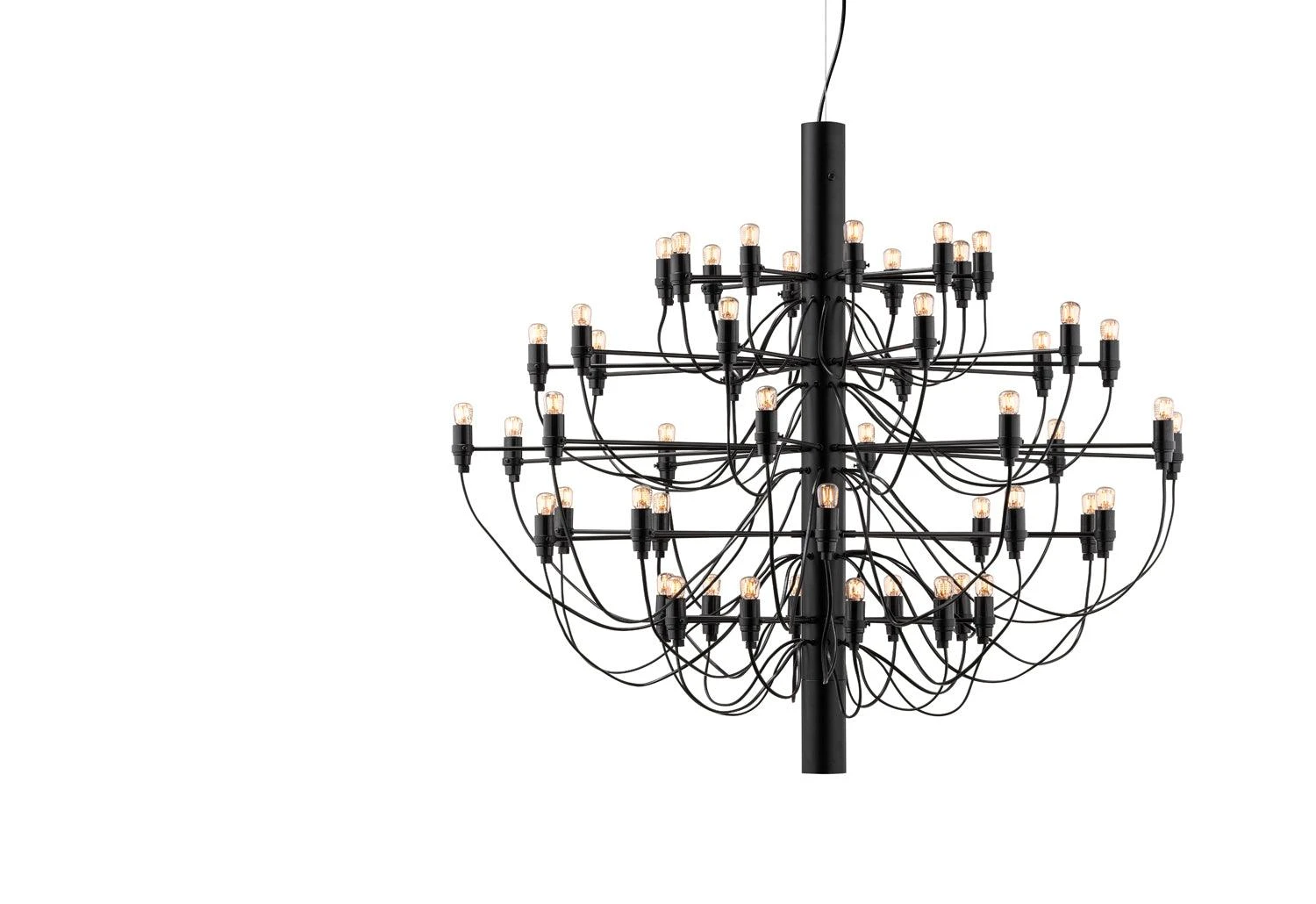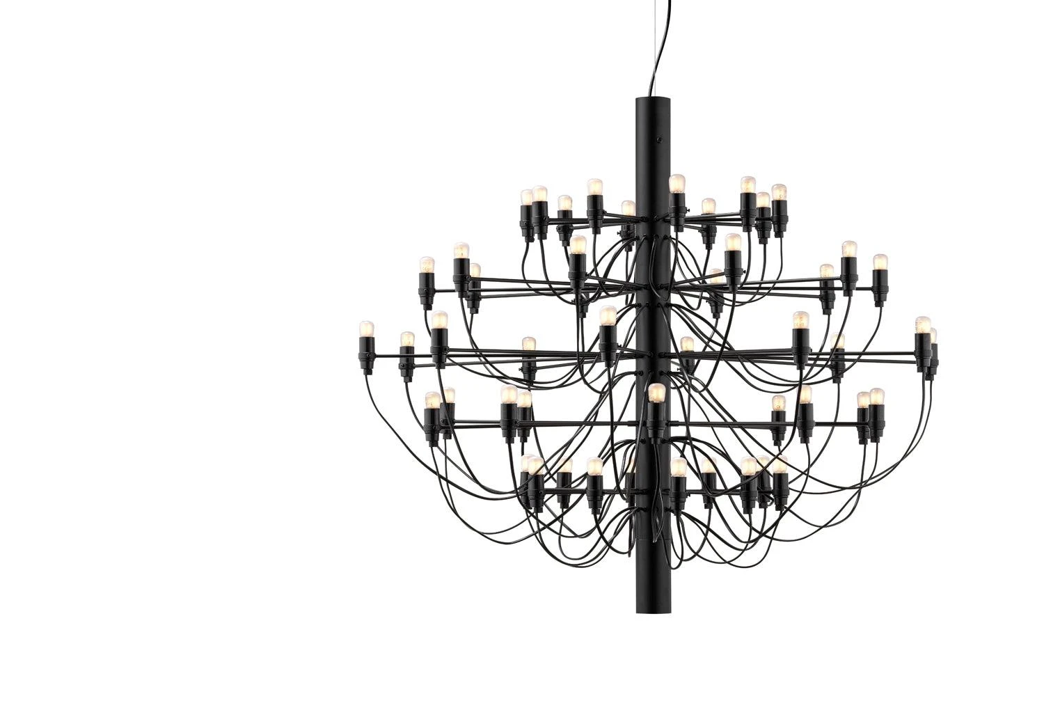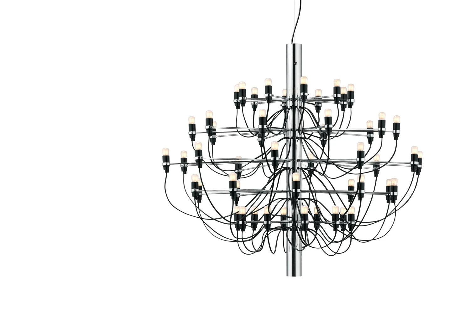 Suspension light consisting of a chandelier-like steel structure with 50 bulbs. Reinventing the classical chandelier for the modern age, Gino Sarfatti’s timeless design offers a striking centre-piece to any room.