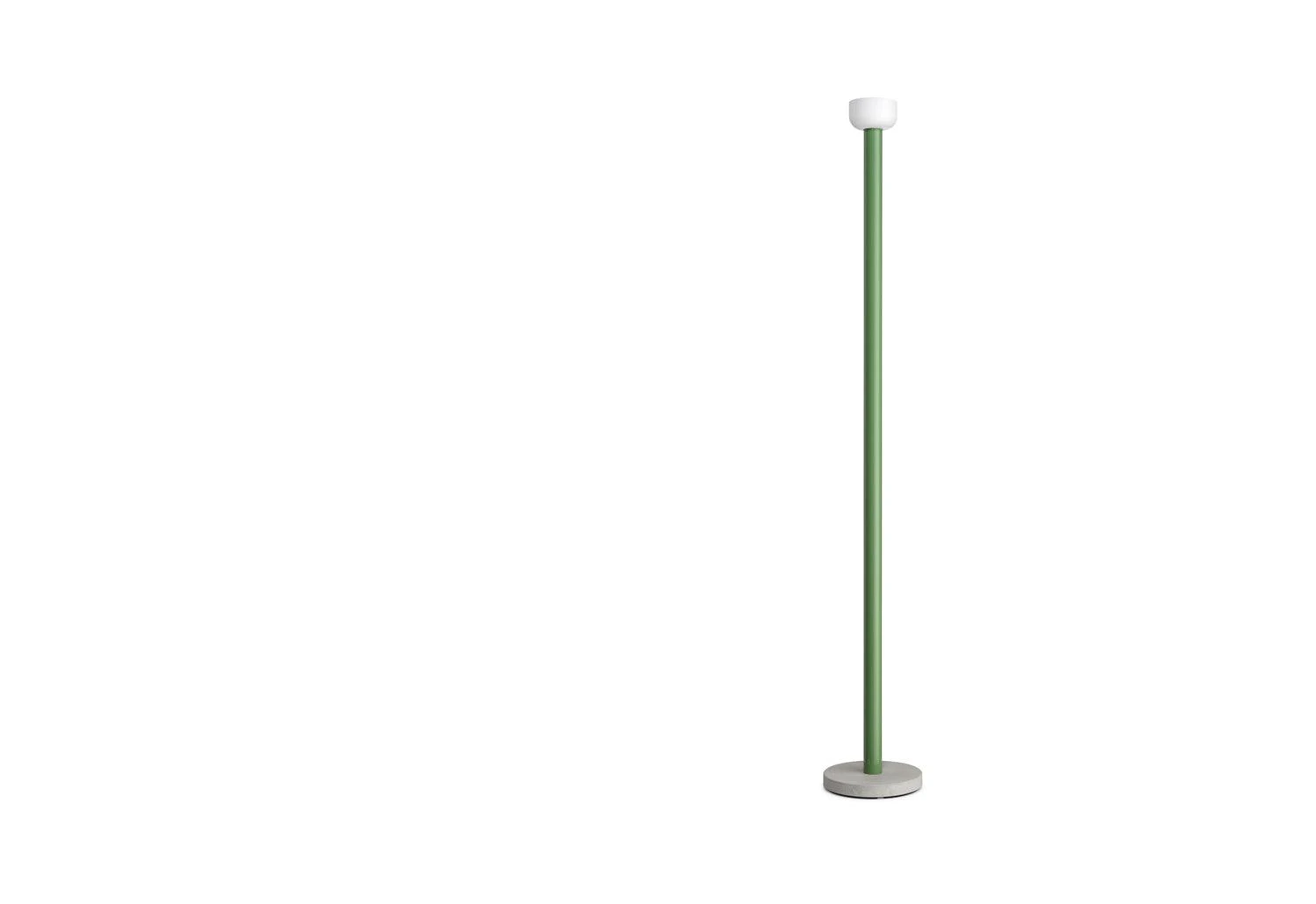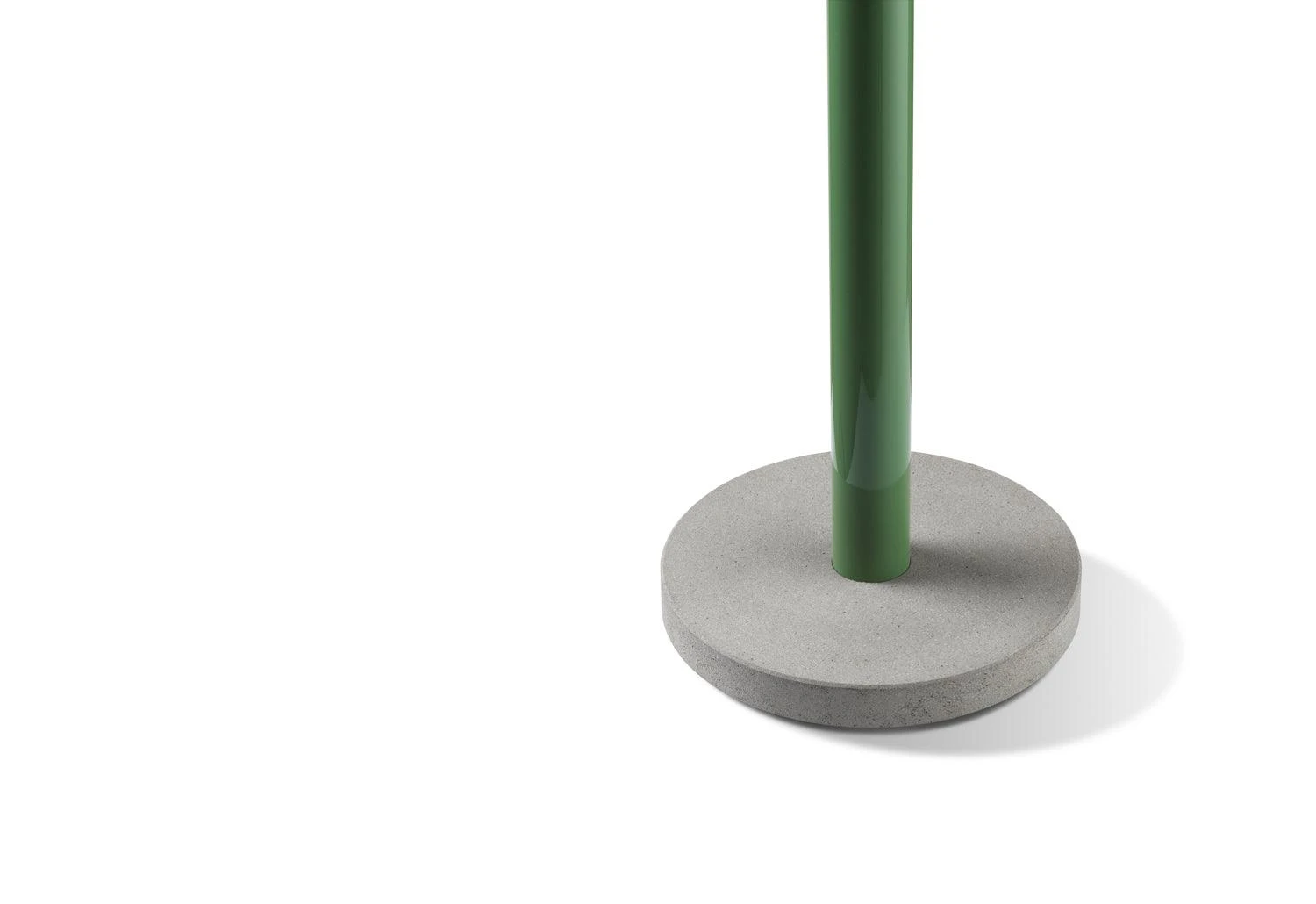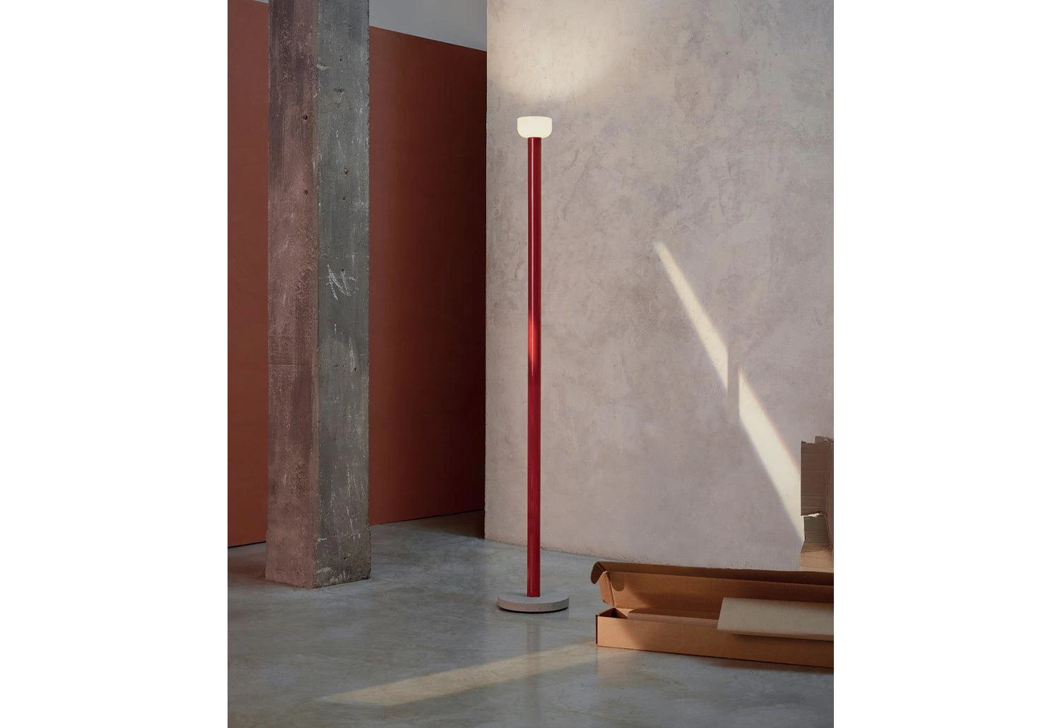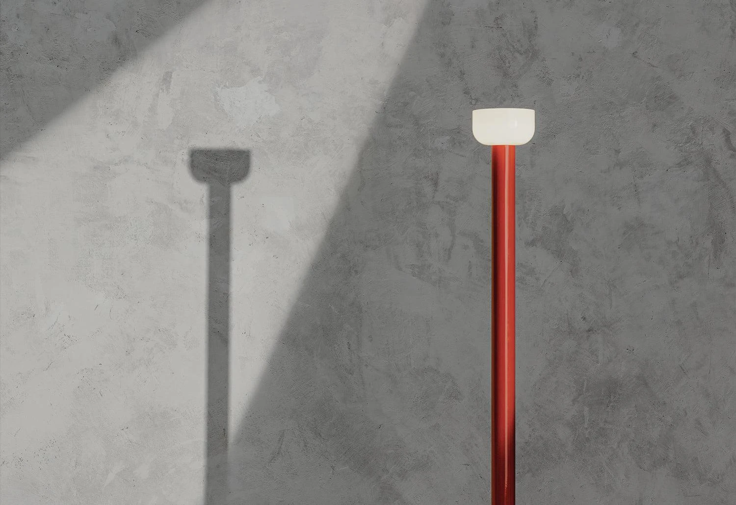 The Bellhop Floor lamp is the newest member of the Bellhop Family, by Barber Osgerby. Similar in form to the portable table lamp, the shade has instead been upturned and crafted in hand-blown opal glass, sitting upon a slender painted aluminium stem with a contrasting concrete base. The bold colour palette and selected materials visually referencing the Memphis design movement.