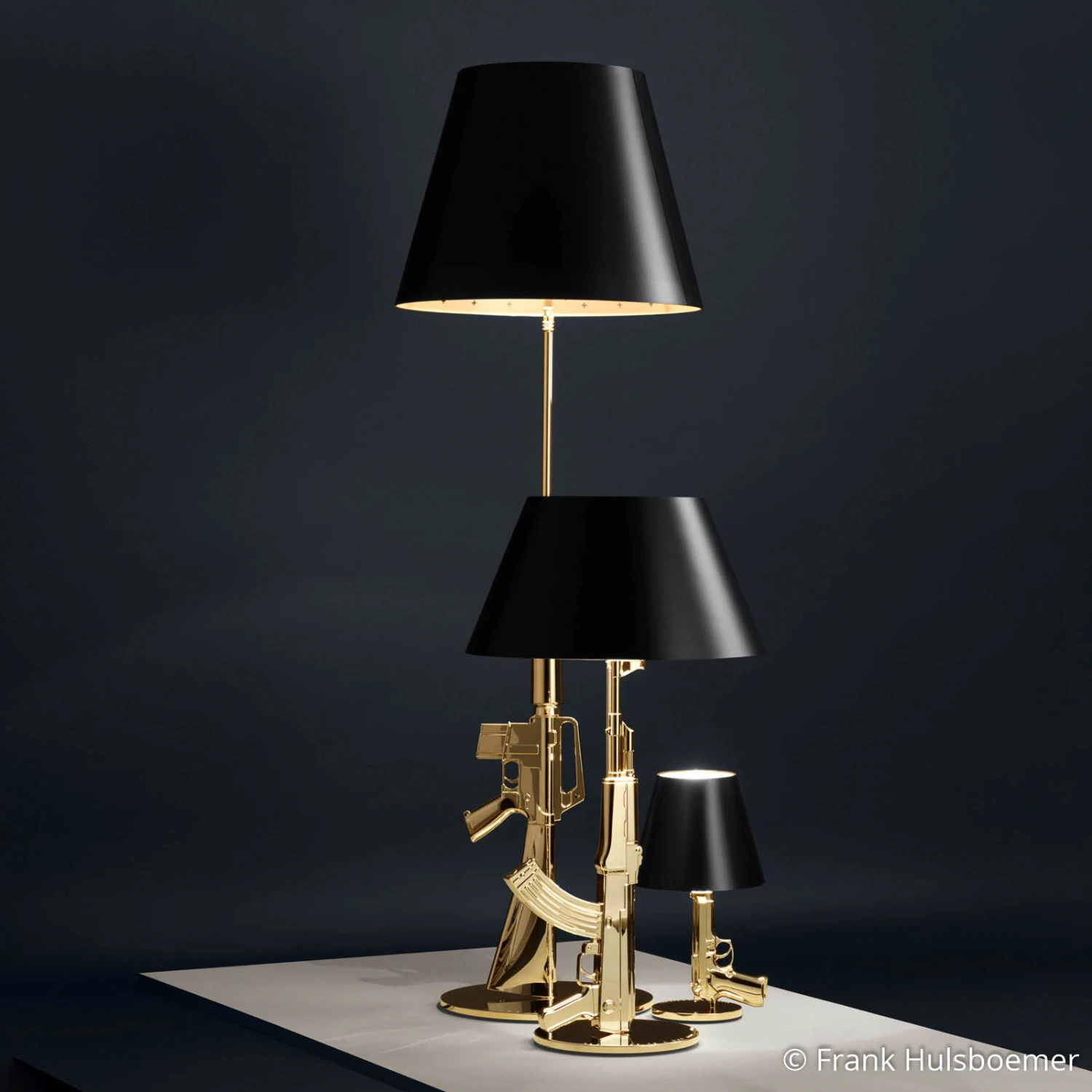 You may find the design of the table lamp shown provocative, because a gun as a lamp base is anything but ordinary and quite debatable. However, this also shows that designer Philippe Starck has succeeded in intelligently realizing his intention of attracting attention. Indeed, it is not a question of considering the table lamp as a symbol of power, but rather it must be pointed out that it carries a socially critical message. Indeed, it is very true that weapons all over the world contribute significantly to discord and cause endless loss of life. At the same time, the everlasting and seemingly never-ending desire for profit is a supporting element for the production and sale of weapons, and it is precisely such unethical behavior and morally indefensible economic mechanisms that the designer table lamp is intended to draw attention to. Therefore, the inscription on the base of the table lamp is not by chance “Happiness is a hot gun”.