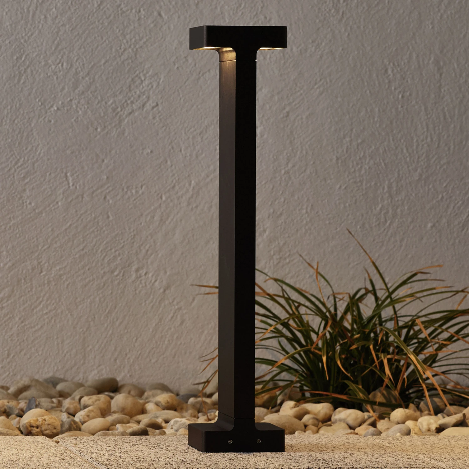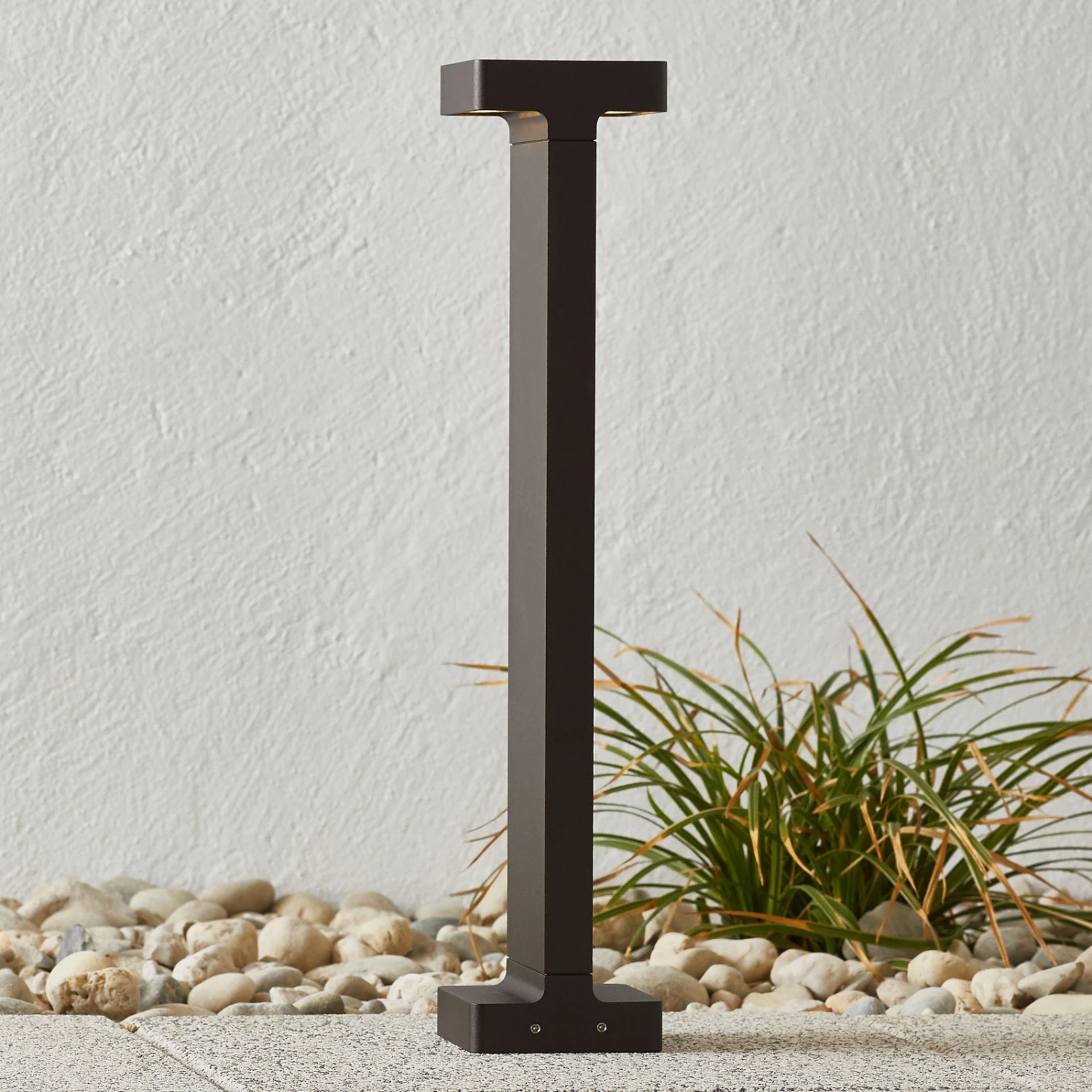 Due to a double powder coating of the surface, this dark brown LED base lamp Casting T 100 is particularly resistant to weathering. The angular luminaire, reminiscent of T-profiles, was made of extruded and die-cast aluminum, and the surface was first sandblasted to achieve better adhesion of the coating. The first epoxy powder coating provides resistance to mechanical and chemical influences, the second layer is made of polyester and protects the surface and thus the dark brown color from UV rays and from the effects of weather.