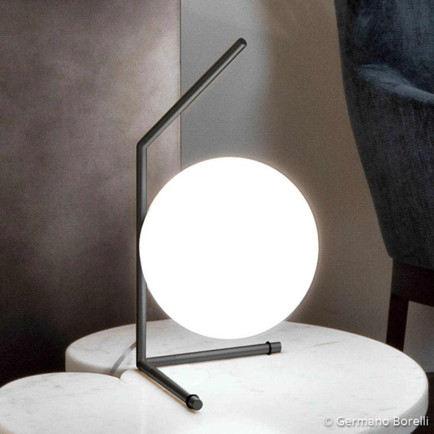 The table lamp IC presents itself as a perfect symbiosis of a large opal glass ball with a filigree metal frame. The appearance gives the impression that the ball is a ball that runs down the bar as if juggling. The opal white glass of the shade provides an even and glare-free light glow, making the table lamp a popular object for accent lighting.