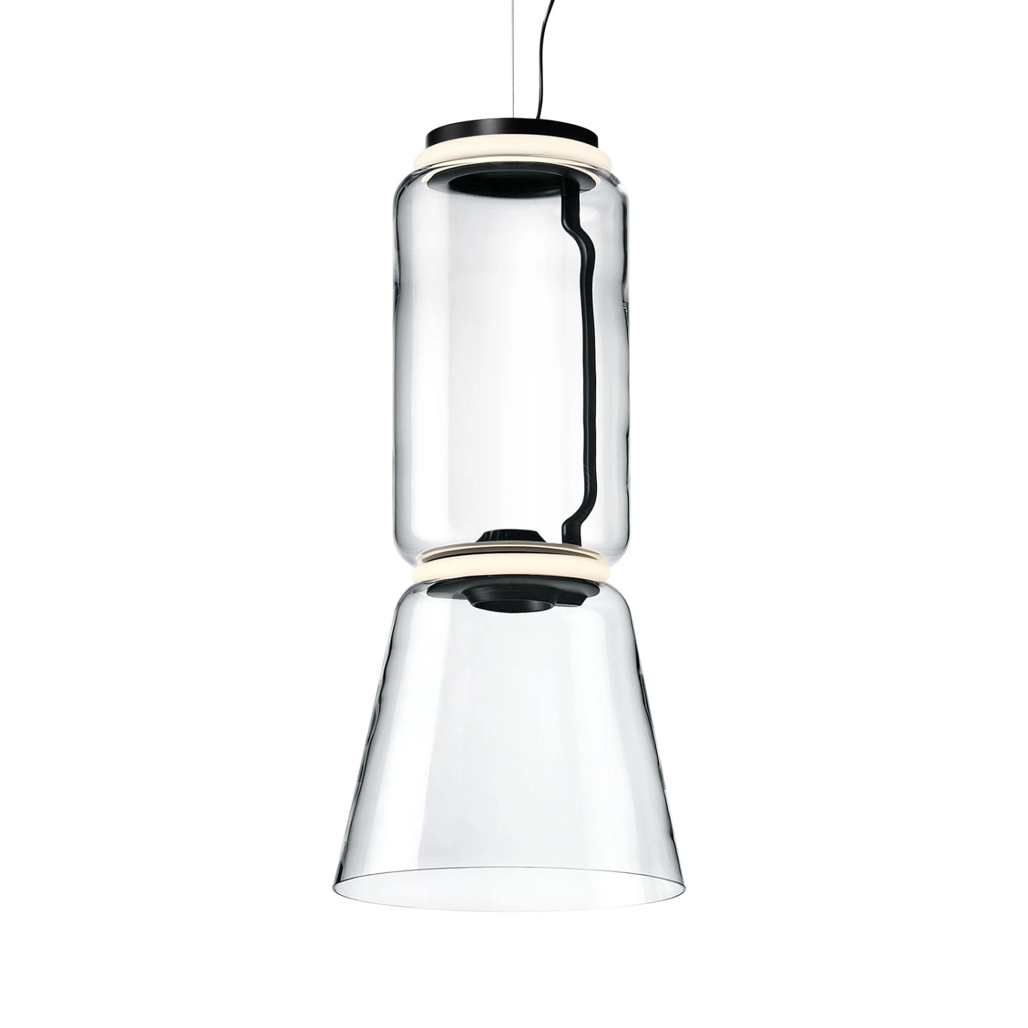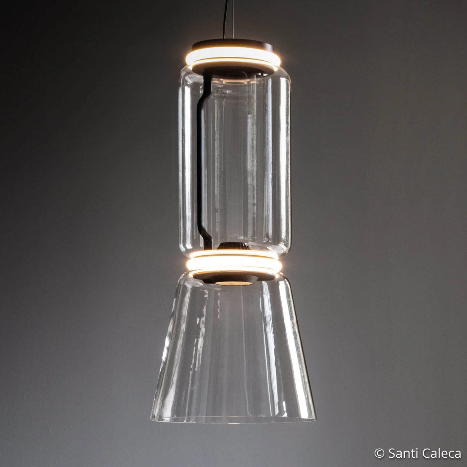 The individual glass blocks are hand-blown and designed to be transparent. The base of the pendant lamp is formed by cylindrical glasses, which are complemented at the bottom by a cone-shaped glass element. The result is a modern light object that merges with excellently calibrated LED lighting. When switched on, the pendant lamp emits warm white light into the room and thus skillfully sets accents. Both in living areas and in spacious entrance areas Noctambule comes into its own very well. The use in hotel and restaurant areas can achieve equally impressive lighting.