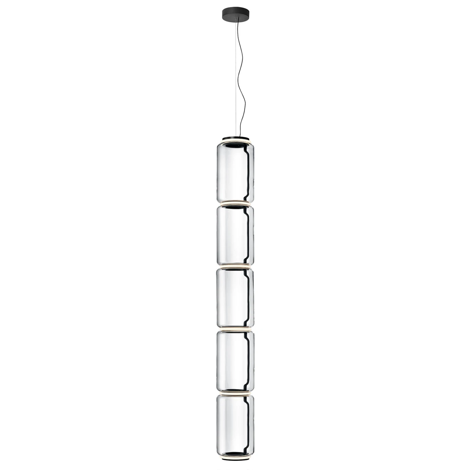 The term Noctambule means a night owl or a night owl and is perfectly interpreted by the LED pendant lamp designed by designer Konstantin Grcic. The individual, cylindrical glass elements are made of mouth-blown, transparent glass and are only interrupted by the narrow, ring-shaped silicone diffusers in opal white color.