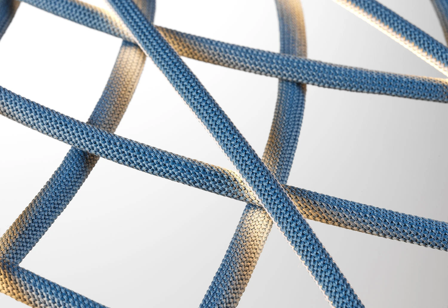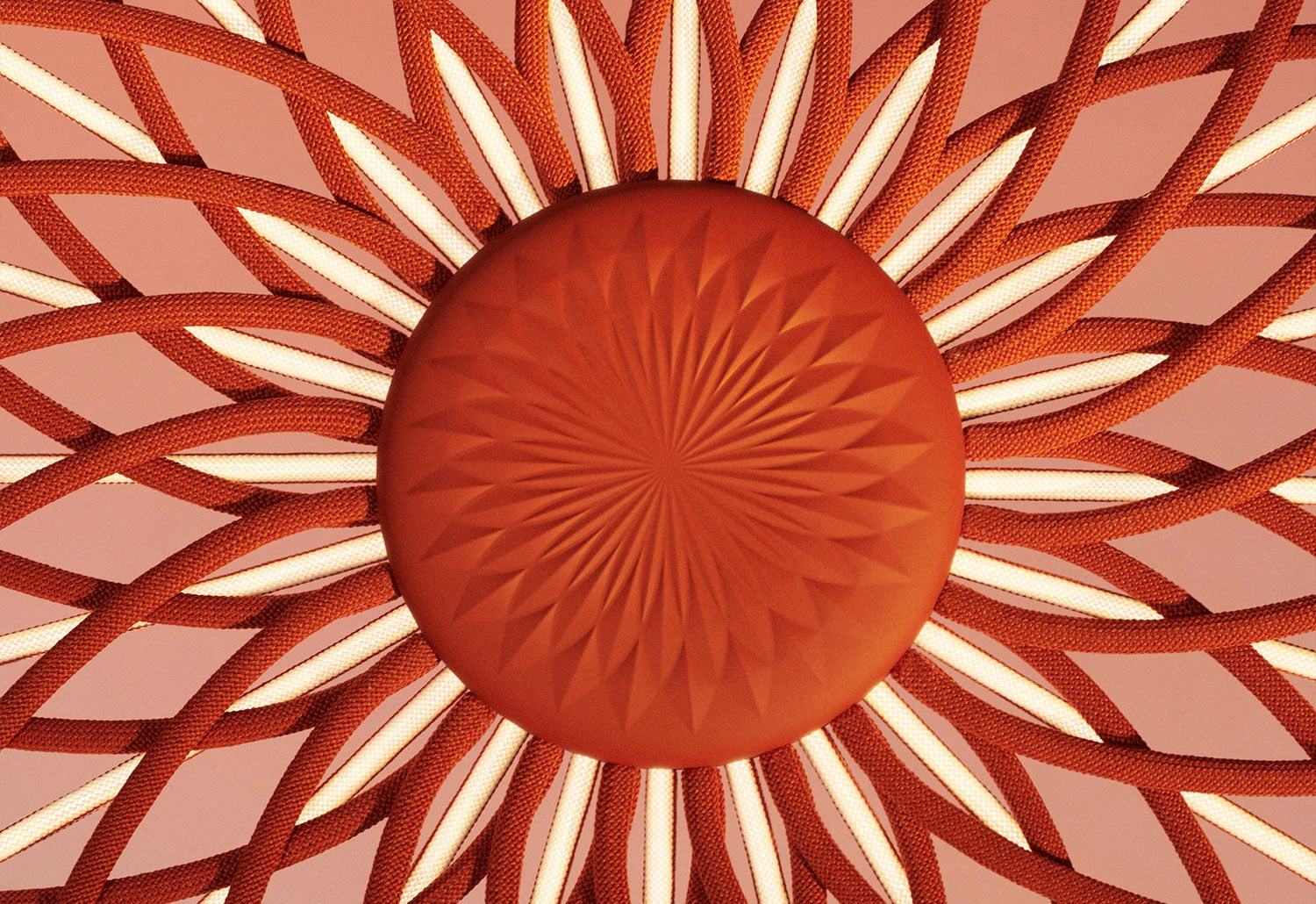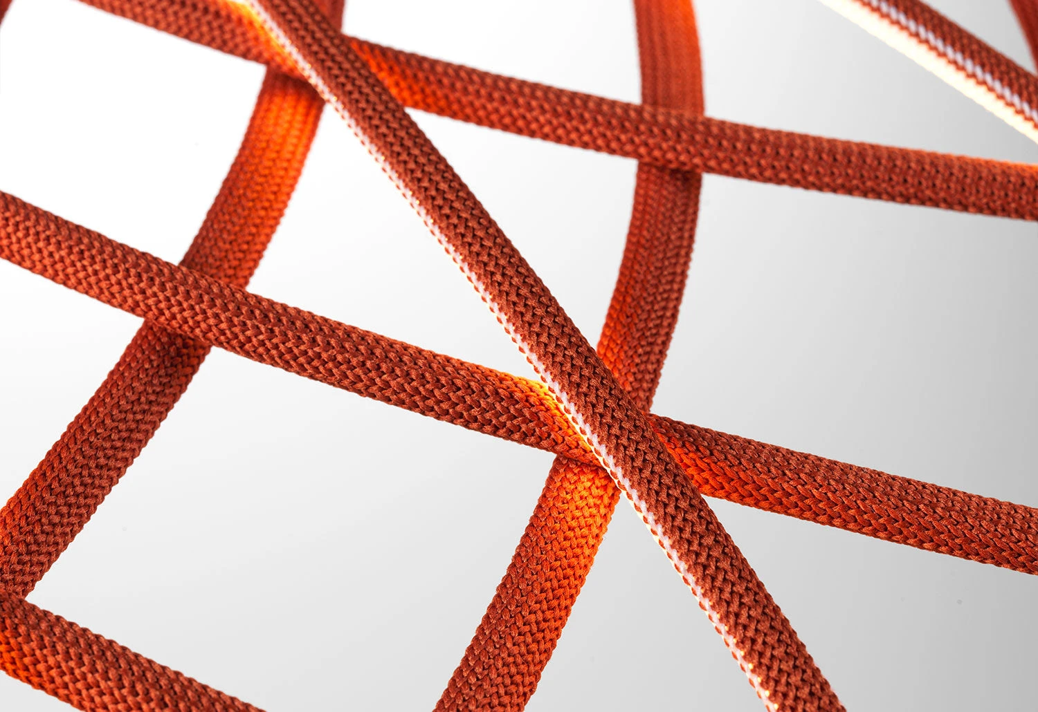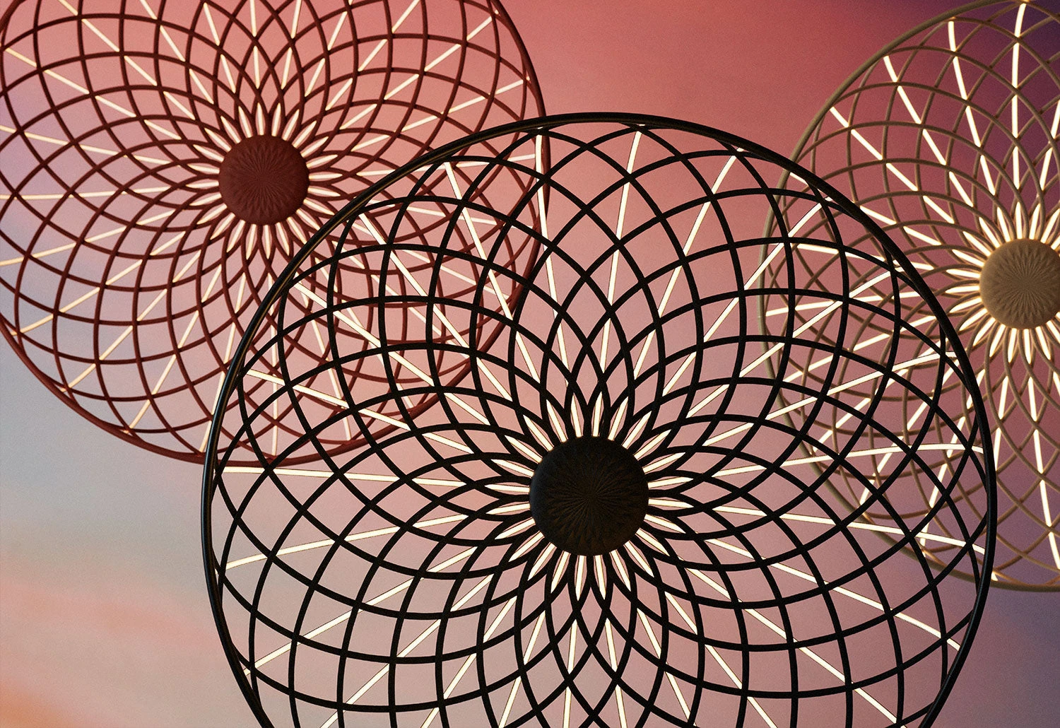 The dome is constructed from a network of tubular mesh made from recycled polyester, with each luminous element powered by a special micro-connector connected to the top. To ensure optimal light emission from the LED modules, these are always white when facing the inside of the dome.