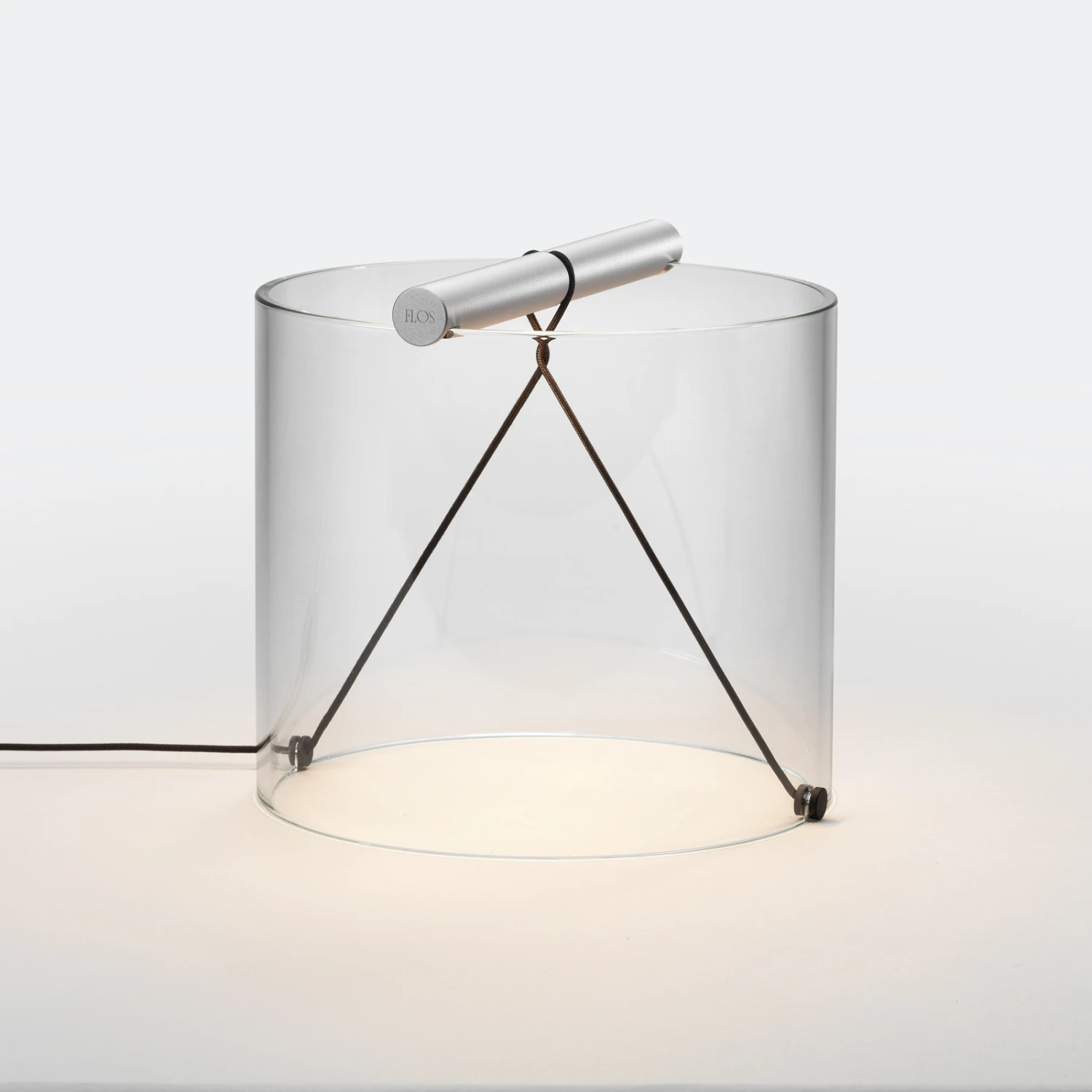 Variable and decorative: Dimmable LED table lamp To-Tie T1, 2,700 K, Ra90The LED table lamp To-Tie T1 not only illuminates tables and sideboards, but is also recommended as decorative lighting throughout the interior, for example on the floor or on a shelf. It consists of an open-design glass cylinder, on the upper edge of which is placed the handle made of aluminum. It is held in position by the textile-sheathed supply cable, which is inserted at the lower edge of the cylinder, wraps around the handle and is fixed again at the bottom on the opposite side of the cylinder. No glue is used in the process, so the components can be separated at any time.To-Tie emits warm white light with very good color rendering. Moreover, via the switch integrated in the cable, it can be switched not only on and off, but also in brightness between 10% and 100 immen. As a cover for the LEDs, a special diffuser made of white polycarbonate is used.The series To-Tie from the house FLOS was created by the Italian designer Guglielmo Poletti.