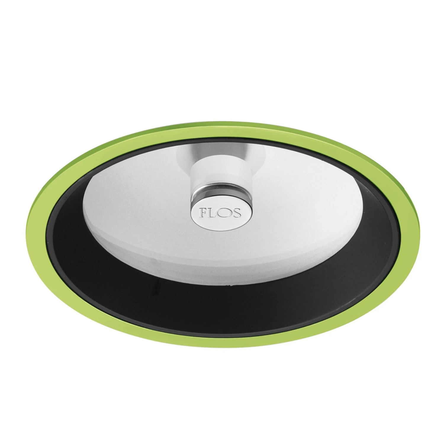 Attractive downlight Wan with satin glass plate, designed by Johanna GrawunderThis downlight of the designer Johanna Grawunder has been designed in an attractive appearance and is suitable for use in private premises, but can of course also be used in commercial objects. The frame of the recessed luminaire is optionally white, black, aluminum-colored or green and depending on the selection, special accents can be set, whereby the green variant is of course a very special highlight with a refreshing effect. Unlike most recessed luminaires, the halogen bulb is covered by a satin glass plate, creating a pleasant distribution of light that contributes to a cozy and inviting atmosphere. In the center of the glass plate also sits a silver button with the words FLOS. Wan comes with two interchangeable inner rings in the colors green and black. So you can give the lamp – depending on your wishes – a different look.For over 50 years now, the company FLOS exists, which designs with a squad of renowned designers special and high-quality lamps, which are widely recognized internationally and have won many awards.